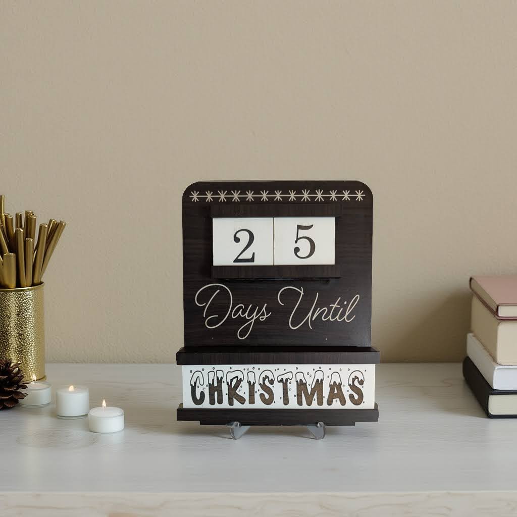 It features a rich, dark wood finish with elegant white script reading "Days Until" and bold, interchangeable events at the base.
